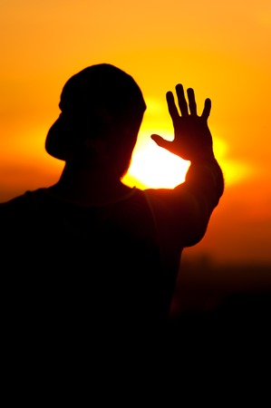 Silhouette of a man against the background of the sun and yellow at sunset sky. Hands are raised up to the sun.
