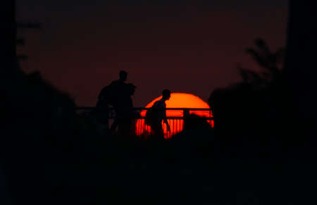 Silhouette of people at a panoramic viewpoint and looking at a beautiful sea, sunset. People unrecognizable.