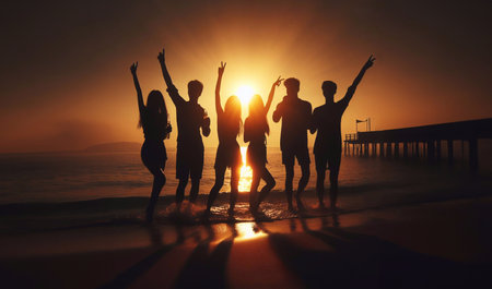 Photograph of group silhouette jumping up on the beach, golden hour, AI Generated.