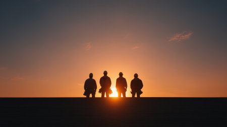 This image showcases four workers silhouetted against a vibrant sunset, emphasizing teamwork and dedication in a construction setting, capturing a moment of reflection.