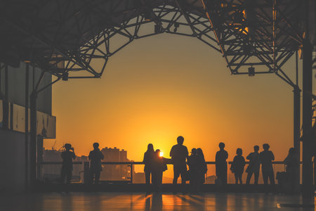 Silhouettes of a group of people standing against a cityscape at sunset, capturing a moment of reflection and unity.