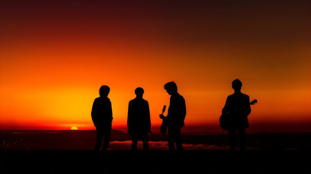 Four Friends Silhouetted Against Fiery Orange Sunset Over Mountain Landscape, Adventure Concept