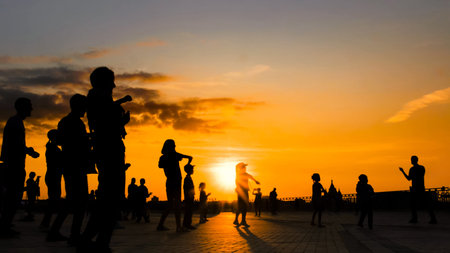 silhouette group of people sitting look at sunset light with orange sky at Phuket, Thailand