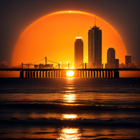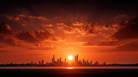 A striking view of a vibrant sunset illuminating a city skyline. The large sun casts a warm glow against a vivid orange sky, creating a serene and dramatic atmosphere.