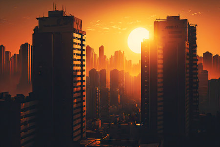 high-rise buildings in city skyline against setting sun city rooftop view, created with generative ai
