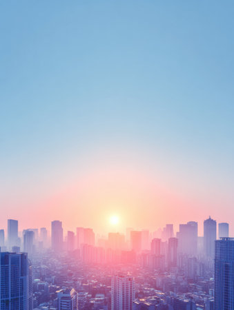 This stunning cityscape showcases an urban skyline at sunrise, shrouded in morning haze. Tall skyscrapers dominate the horizon with beams of sunlight piercing through the fog, creating a mystical atmosphere. The background is a gradient of soft blue and golden hues, evoking tranquility and hope for the day ahead.