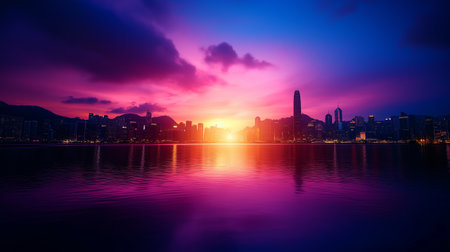 A Colorful cityscape of Hong Kong at night with skyscrapers reflecting in water, showcasing vibrant hues of purple, pink, and orange. stunning view that evokes tranquility and awe