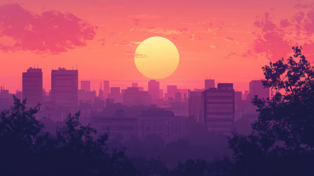 A stylized illustration depicts a city skyline at sunset with a large, vibrant sun and hazy purple and pink tones.