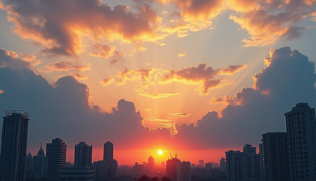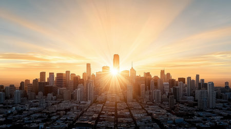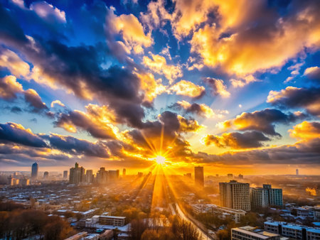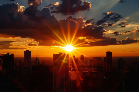 Stunning sunset over city skyline, with rays of sunlight breaking through clouds, illuminating tall buildings and creating warm, vibrant atmosphere