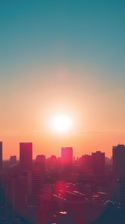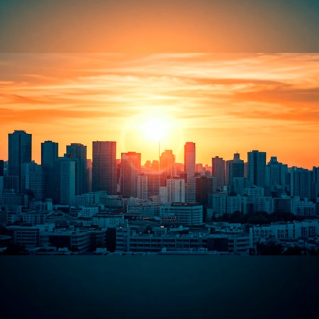 Breathtaking Sunset Over City Skyline with Vibrant Colors and Urban Landscape Illuminated by Warm Sunlight at Dusk
