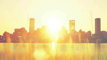 A city skyline bathed in golden hues of sunset, radiating warmth and beauty