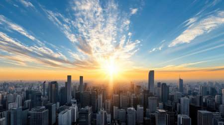 This dazzling image captures a sunrise over a sprawling cityscape, with skyscrapers silhouetted against a vibrant sky. The warm hues of orange and yellow permeate the atmosphere, creating an enchanting glow. Wispy clouds linger above, adding depth to the scene while soft shadows accentuate the urban expanse.