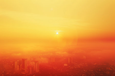 The radiant sunset over an urban skyline during a heatwave, with sunbeams that highlight the extreme temperatures.