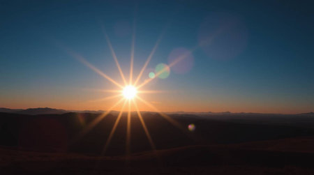 A stunning image of a bright sunrise with radiant sunbeams shining through a clear blue sky, creating a vibrant and uplifting atmosphere perfect for various uses.