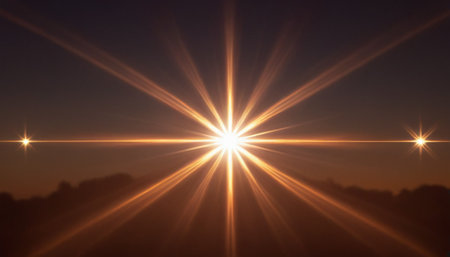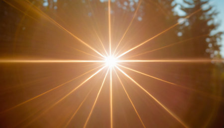 A bright starburst lens flare with golden rays emanating from a central light source with bokeh.