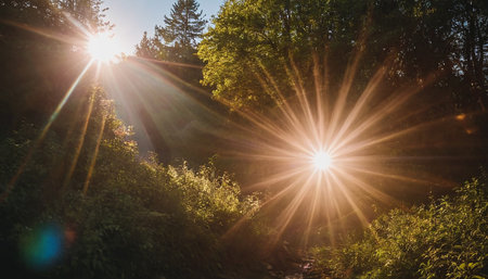 Golden sunbeams pierce through a vibrant forest canopy, illuminating a breathtaking landscape scene. Shafts of sunlight cascade through the trees, creating stunning beams of light and shadows amidst the lush green foliage. This natural scenic view showcases the beauty and peaceful serenity of the woods, perfect for evoking inspiration and a sense of freedom. Ideal for projects needing imagery of nature, the outdoors, and summer scenes, this image offers a tranquil and idyllic atmosphere.