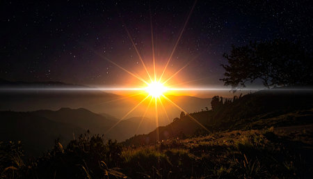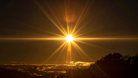 Golden Sunburst Display Illuminating the Dark Sky, A Majestic Sun Flare Against Black Background