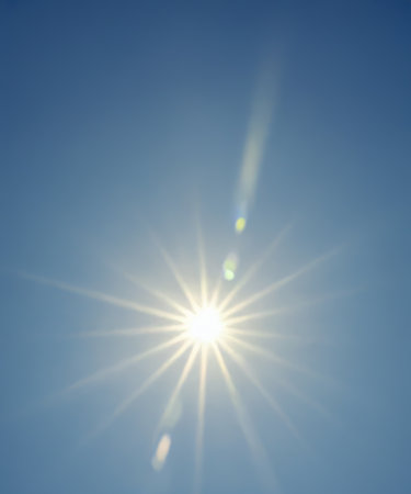 A bright and clear midday sky with intense blue tones and the sun shining brightly overhead.