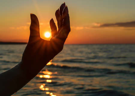 Hand of a man against the background of a beautiful sunset. The concept of freedom and hope.