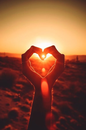Generative AI : young woman making heart with her hands round the sun in sunset