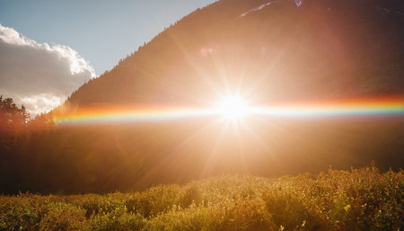 sunset in the mountains with sunbeams and lens flare effect