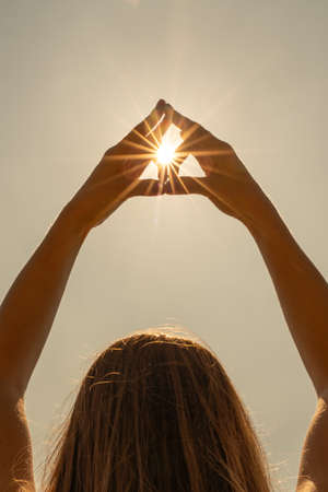 Silhouette of a woman holding the sun in her hands
