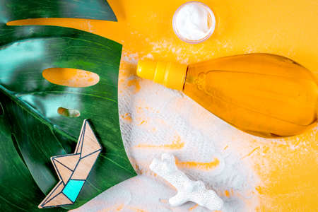 Two tubes with mock up sunscreens on a yellow summer background. UV protection of the skin with an SPF filter, hair care-shampoo and conditioner. A safe tan on the beach. Flat lay - resort on the sea.