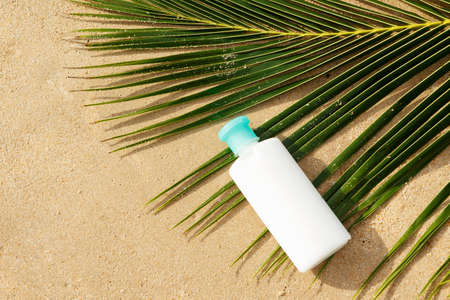 Bottle of sun protection lotion and palm leaf on the beach