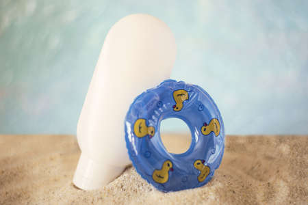Blank cosmetics bottle staying in sand with decorative swimming circle near it.Summer rest concept.