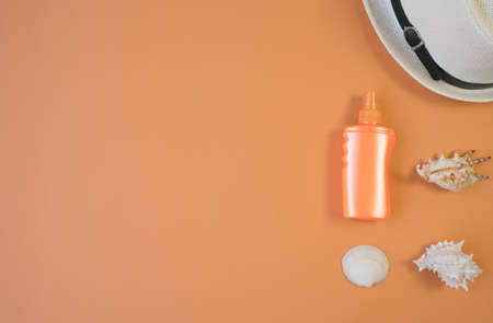 Top view of seashells, sunscreen and hats with copyspace. Summer concept. Orange background. flat lay