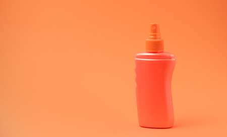 Orange pure tanning lotion or sunscreen bottle for packaging mockup. Bottle and orange background. Minimal summer skincare and sun protection concept. Front view.