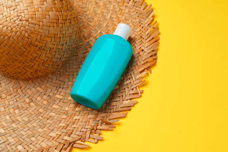 Beach hat and sunscreen bottle. Vacation concept