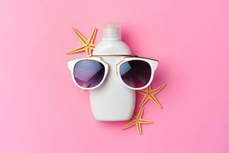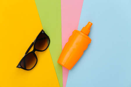 beach holidays. Sunblock bottle and sunglasses on colored background. top view. flat lay