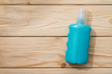 Bottle with sun protection cream on wooden background, top view