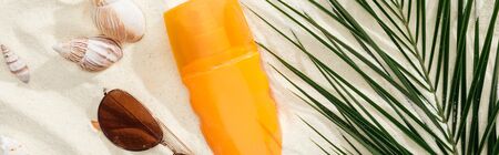 orange bottle of sunscreen on sand with seashells, green palm leaf and stylish sunglasses, panoramic shot