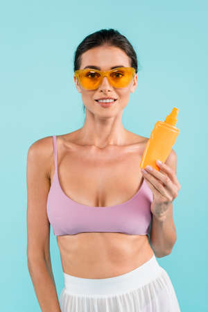 pleased woman in swimsuit and orange sunglasses holding sunblock isolated on blue