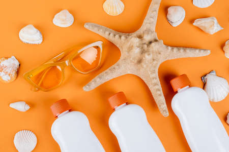 top view of starfish, seashells, sunglasses and white bottles of sunscreen on orange
