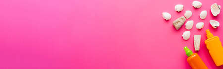 Top view of seashells and bottles of sunscreens on pink background, banner