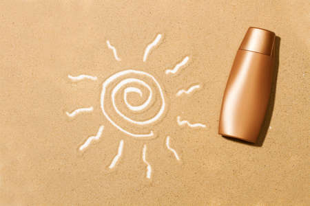 A sun tan lotion bottle and a drawing of the sun on the sand