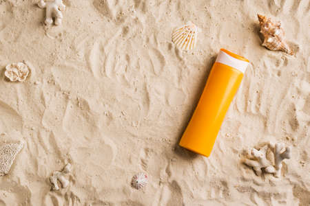 Yellow tube of suncream and seashells on the sand. UV and sunburn protection concept.