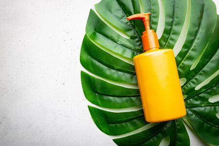 A suncream and cap are on the yellow background. Sun protection products with tropical, palm leaf.