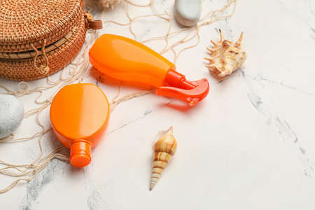 Sunscreen cream bottles with sea shells on blue background