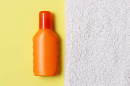 A bottle of sunscreen is sitting on a towel on the beach