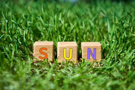 Wooden cube blocks with multicolor SUN text on fresh green grass in sunlight