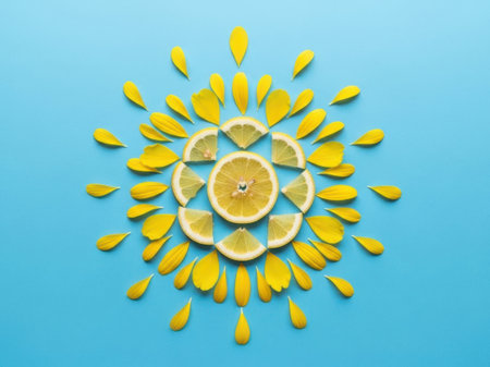 Sliced lemon on a blue background with yellow petals.