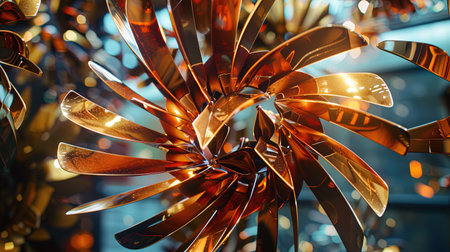 A close-up of an abstract metallic structure with intricate, swirling forms and a bright, glowing light at the center, surrounded by bokeh lights.