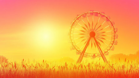 This stunning image captures a ferris wheel set against a colorful sunset, with silhouettes of grass creating a peaceful and joyful outdoor scene.