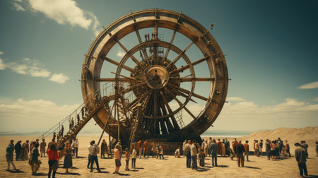 Huge wheel art installation in the middle of a desert with people around it. Burning Man style.