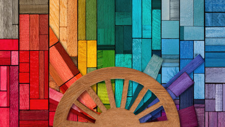 Vibrant image of multicolored wooden blocks arranged in a geometric pattern. A circular element, cut from a light-brown piece of wood, is placed in the lower-right quadrant, adding to the design's visual appeal. The blocks create a sense of color and pattern throughout the image.