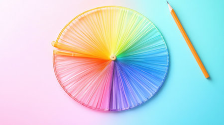 A colorful arrangement of a vibrant color wheel paired with a pencil, set against a soft gradient background, ideal for art and design themes.